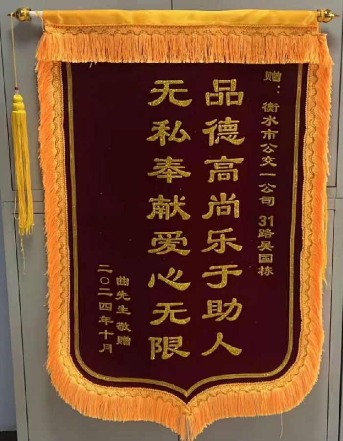 10月8日,一位市民帶著一面“品德高尚樂于助人 無私奉獻(xiàn)愛心無限”的錦旗來到衡水公交一分公司,對31路車長的暖心之舉表示感謝。