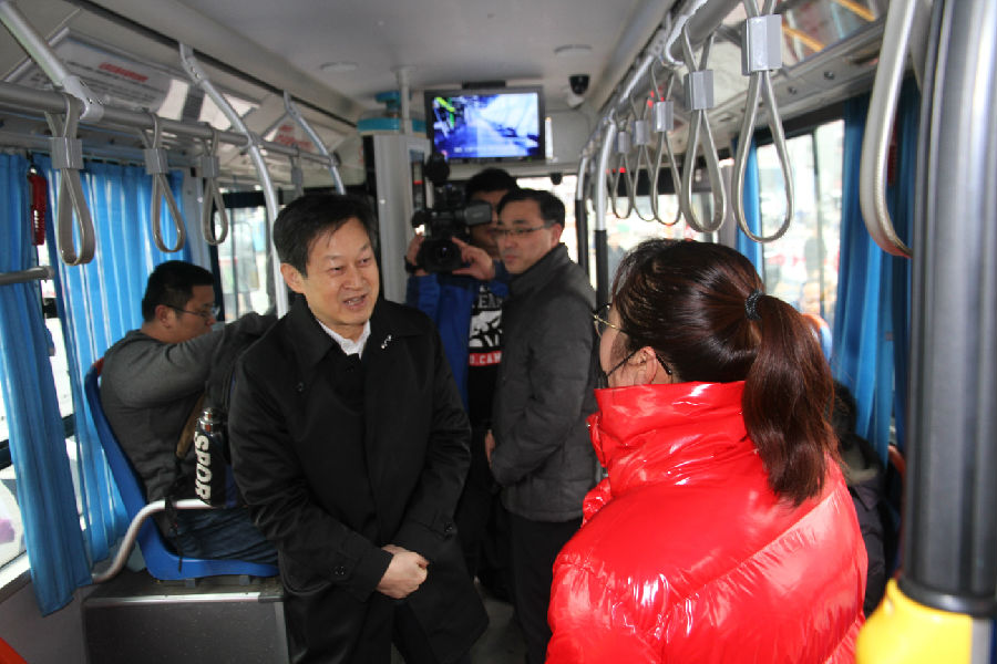 隨后,吳曉華饒有興致的登上2路新能源純電動公交車輛,親切詢問了駕駛員春運期間安全工作情況,并且熱情的同乘車乘客握手、聊天,詳細了解乘客有哪些需求以及對城市公交發(fā)展有哪些建議。