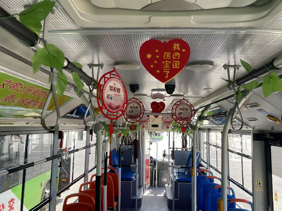 國(guó)慶節(jié)期間,在9路、18路、“衡水湖號(hào)”等10余條公交干線車廂內(nèi)懸掛國(guó)旗、中國(guó)結(jié)、紅燈籠等裝飾,打造“中國(guó)紅”主題文化,積極營(yíng)造國(guó)慶節(jié)喜慶、歡樂(lè)、祥和的氛圍。