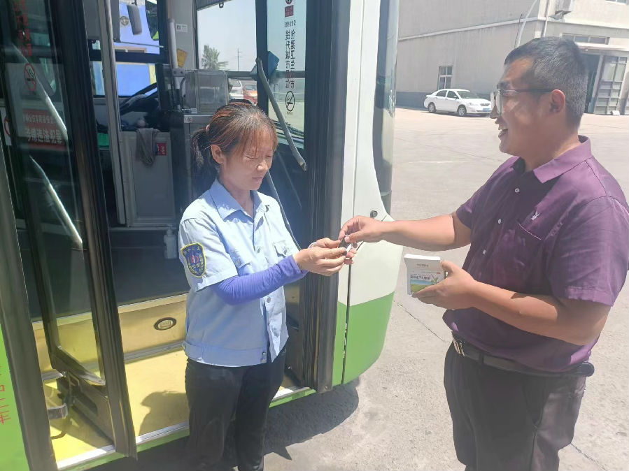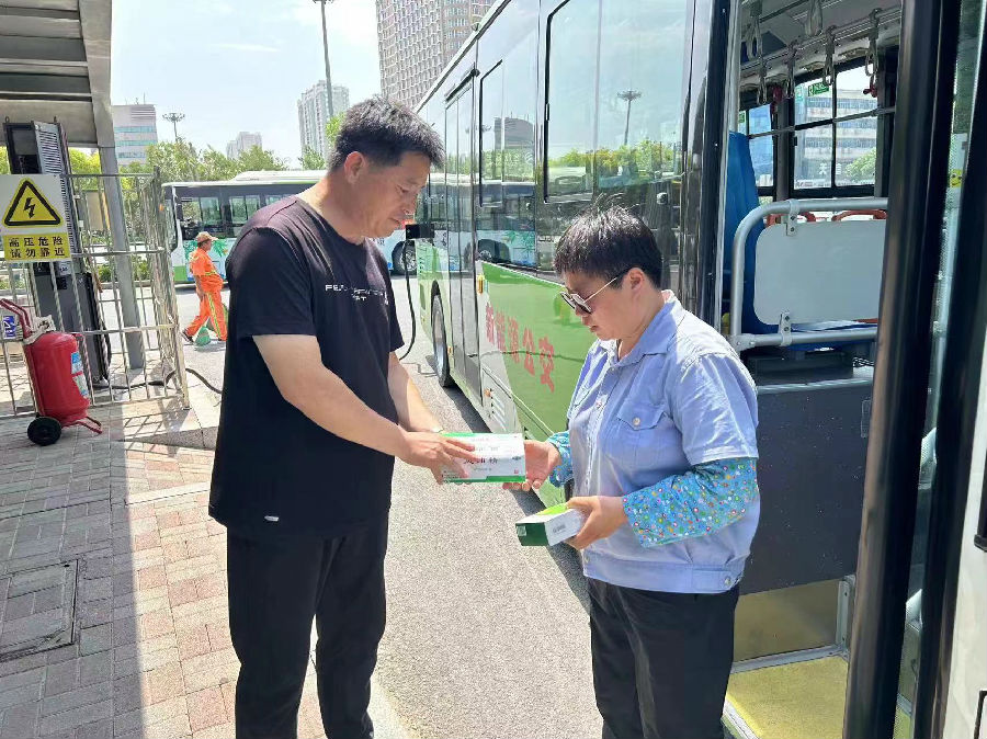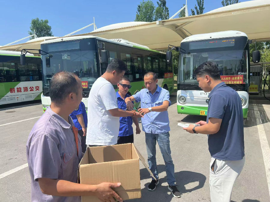 心系職工,送去清涼。為消解酷暑給車長同志們帶來的疲勞和燥熱,在公交樞紐站發(fā)放風(fēng)油精、藿香正氣水、綠豆、西瓜等清涼降暑物品,為一線車長做好防暑降溫,將公司關(guān)懷送到每一位車長手中。